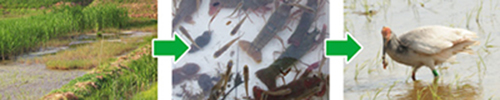 水田に水を溜めたり、自然の湿地を再生したり、ビオトープを設置→小さな生きものが棲むようになる→水田は朱鷺の餌場となります(写真 環境共生型農業)。